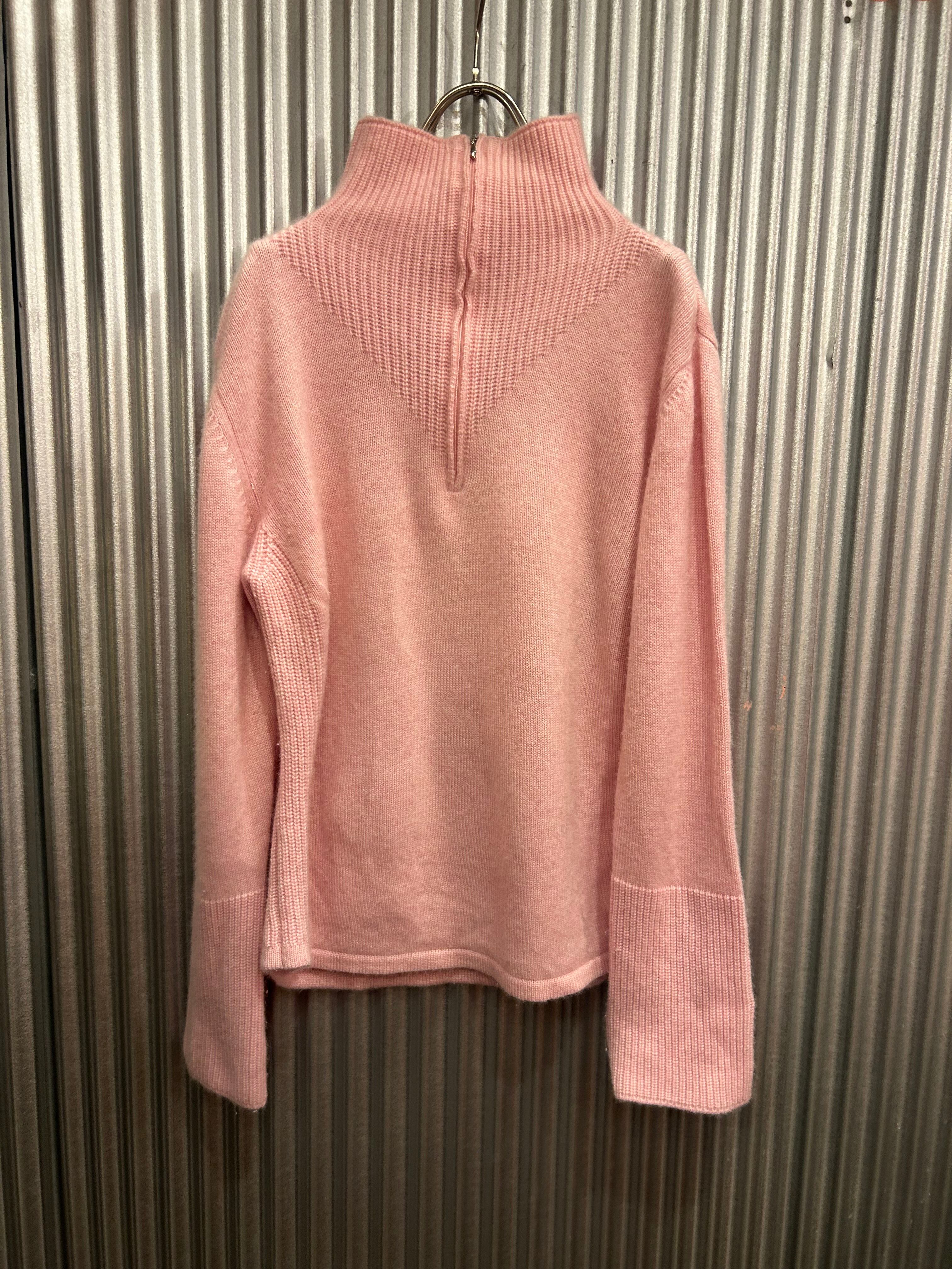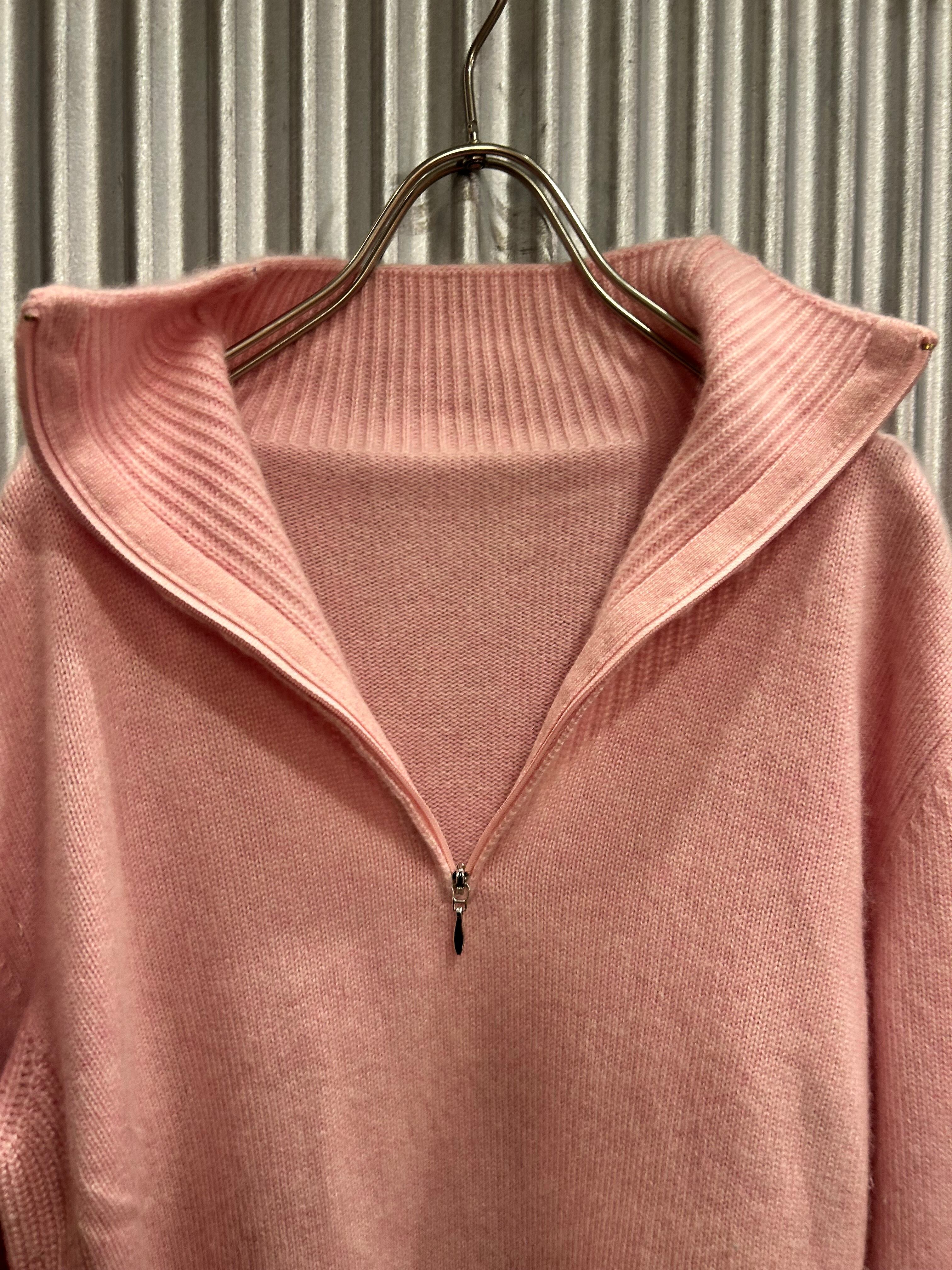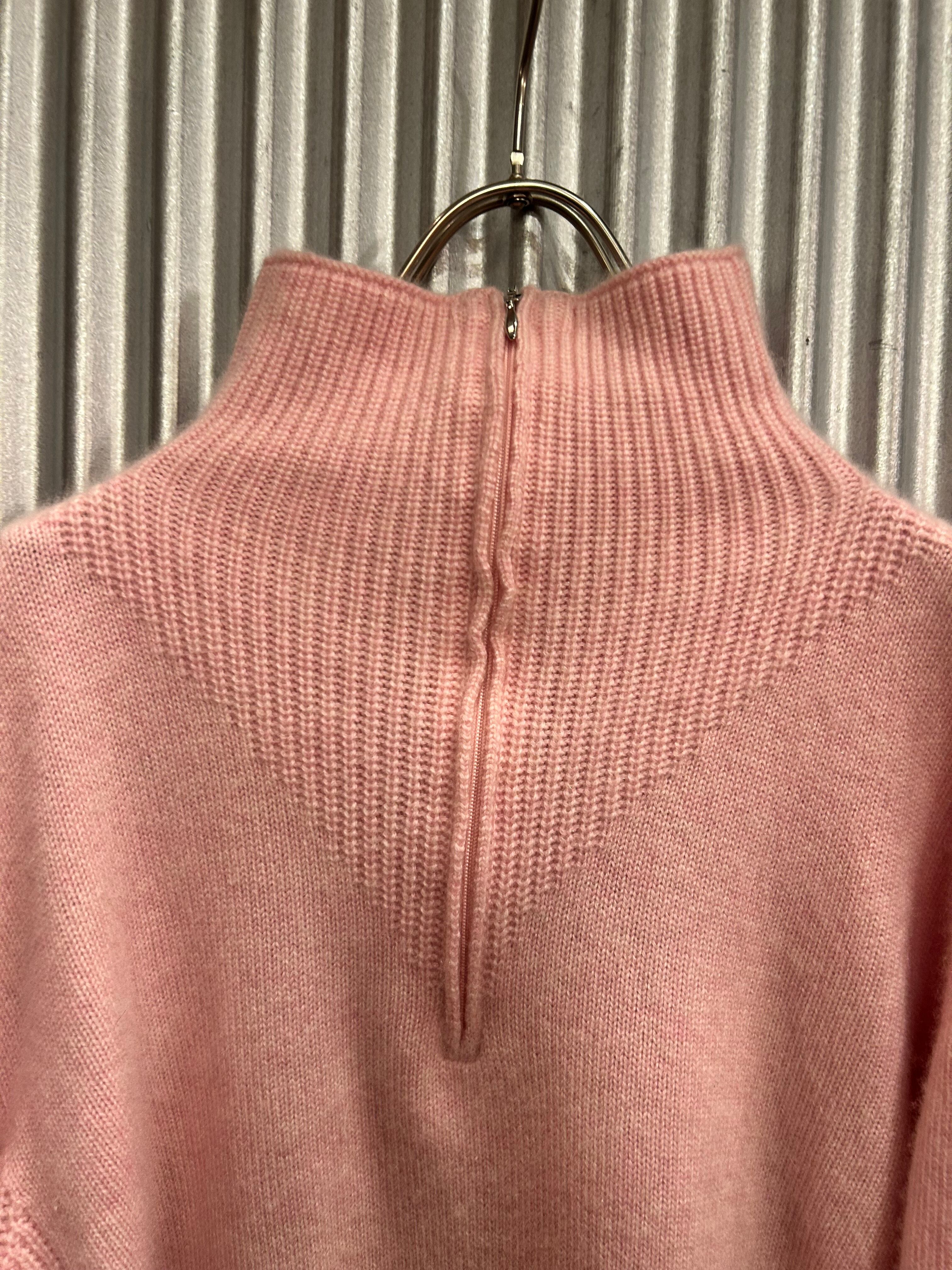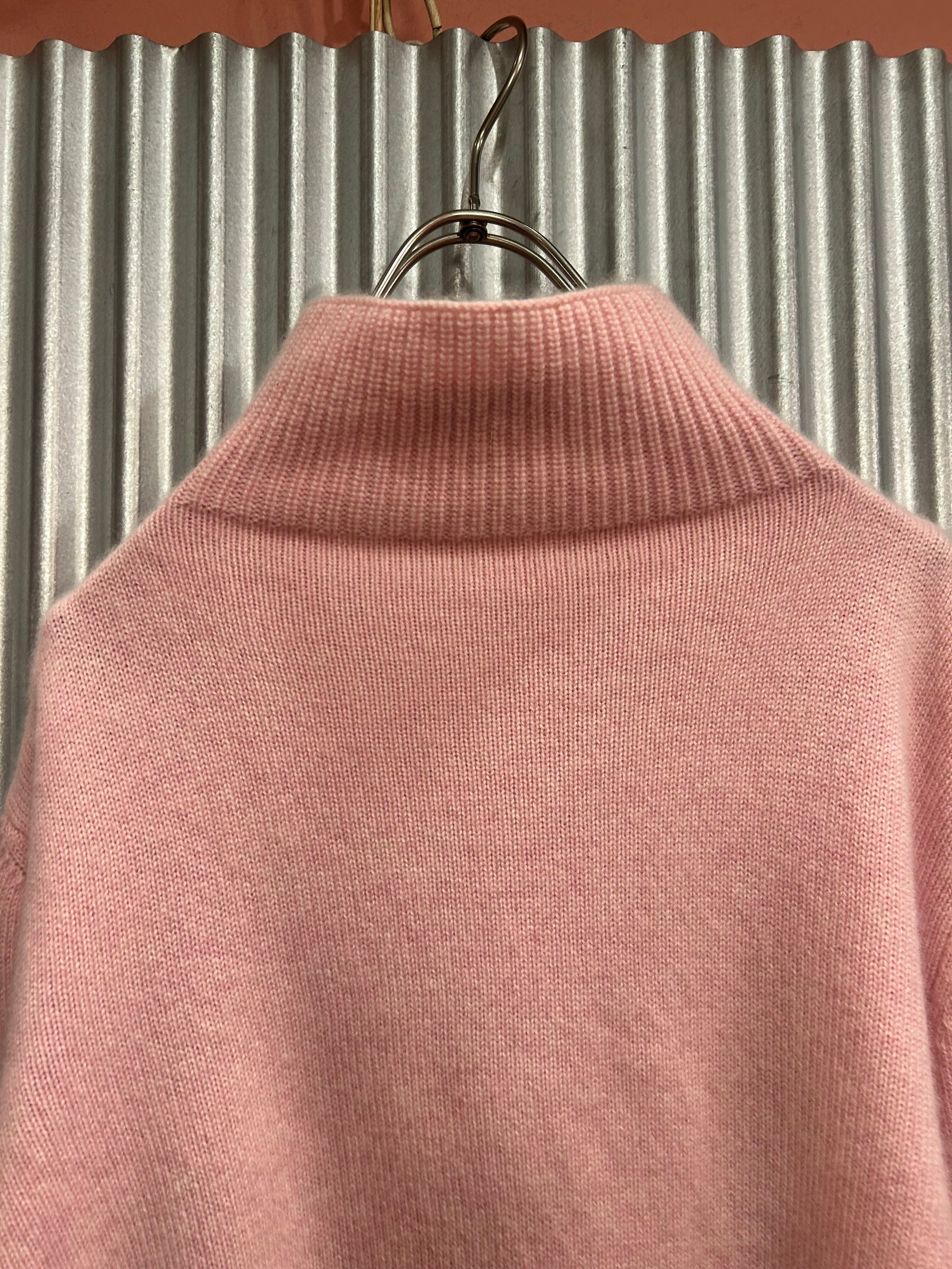 柔らかなピンクカラーが目を引く、ハーフジップデザインのリブニット。