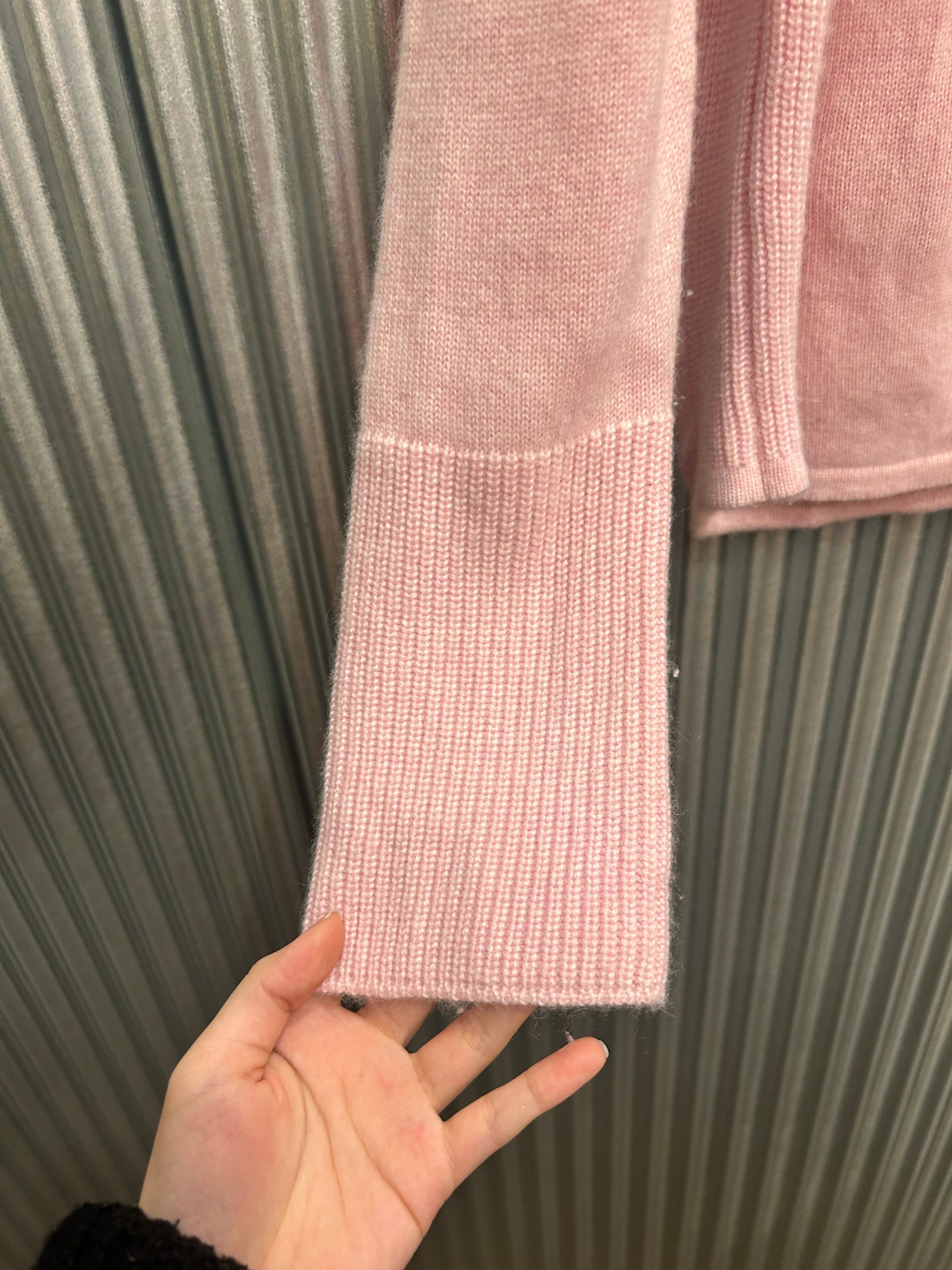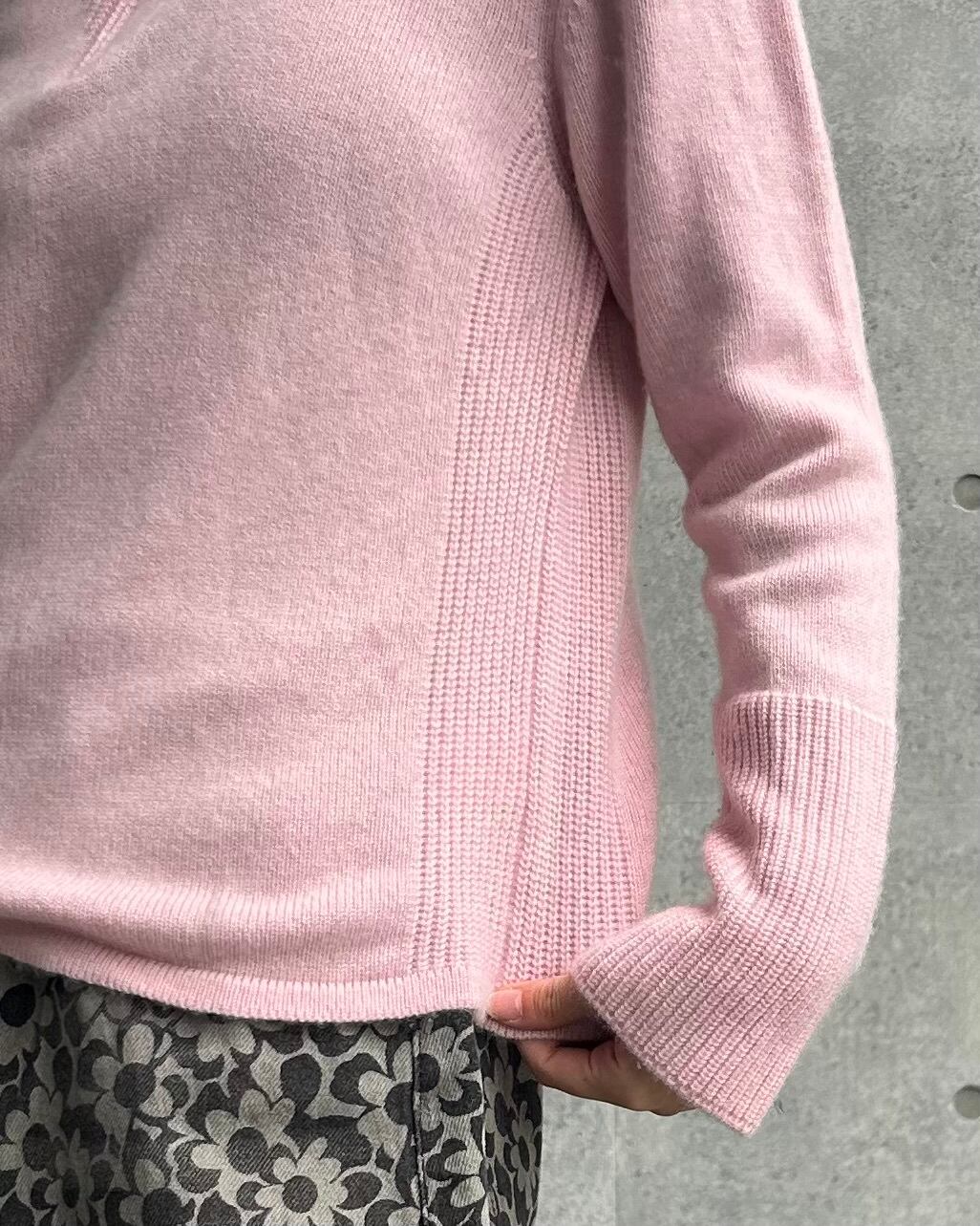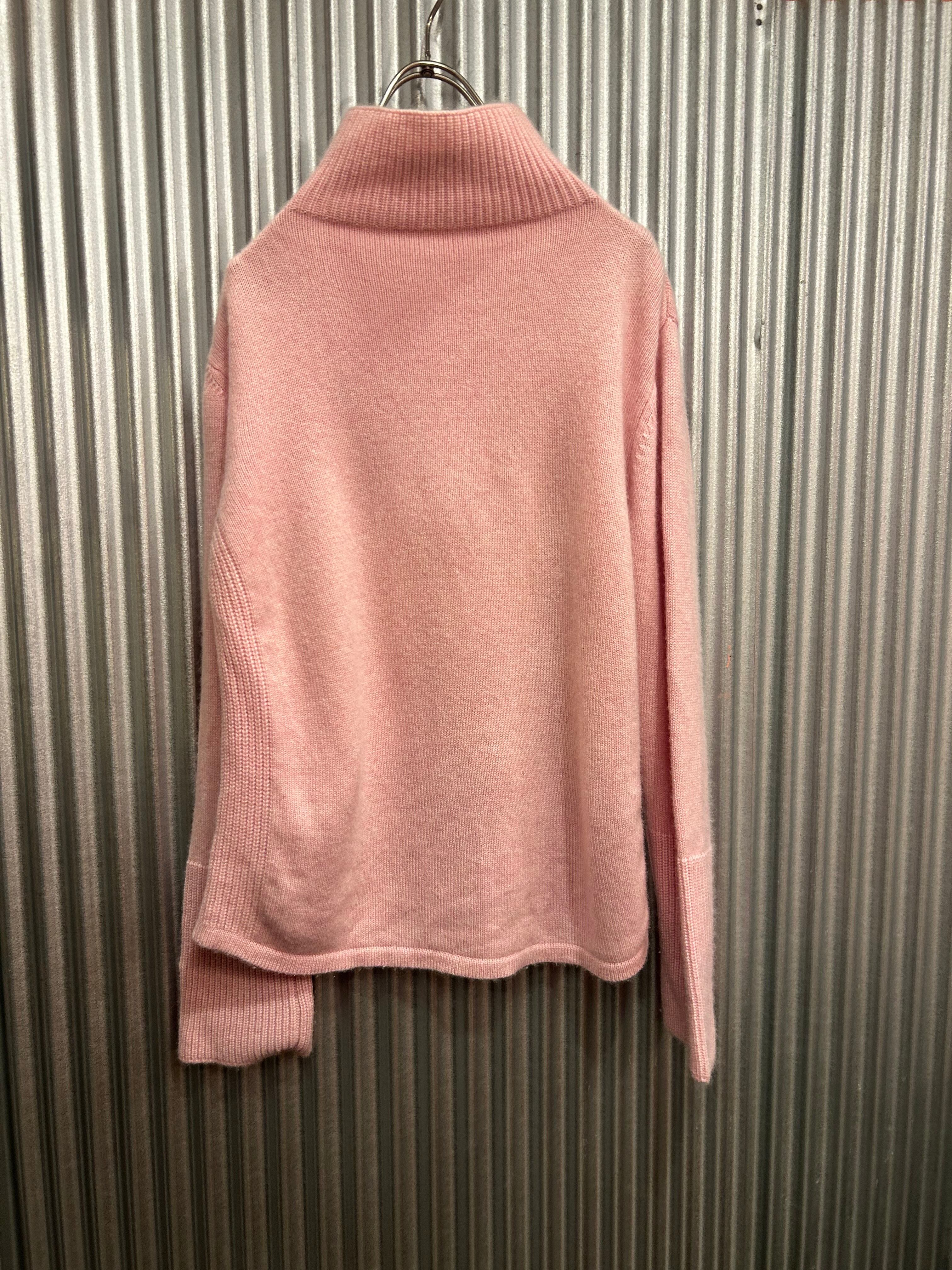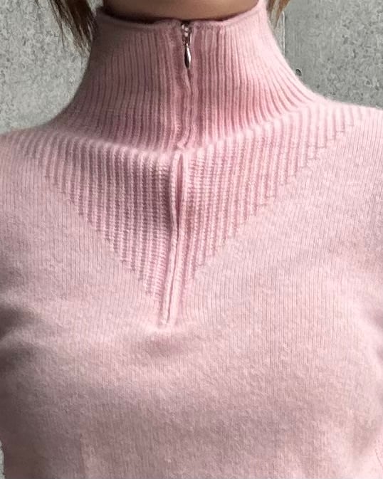 柔らかなピンクカラーが目を引く、ハーフジップデザインのリブニット。