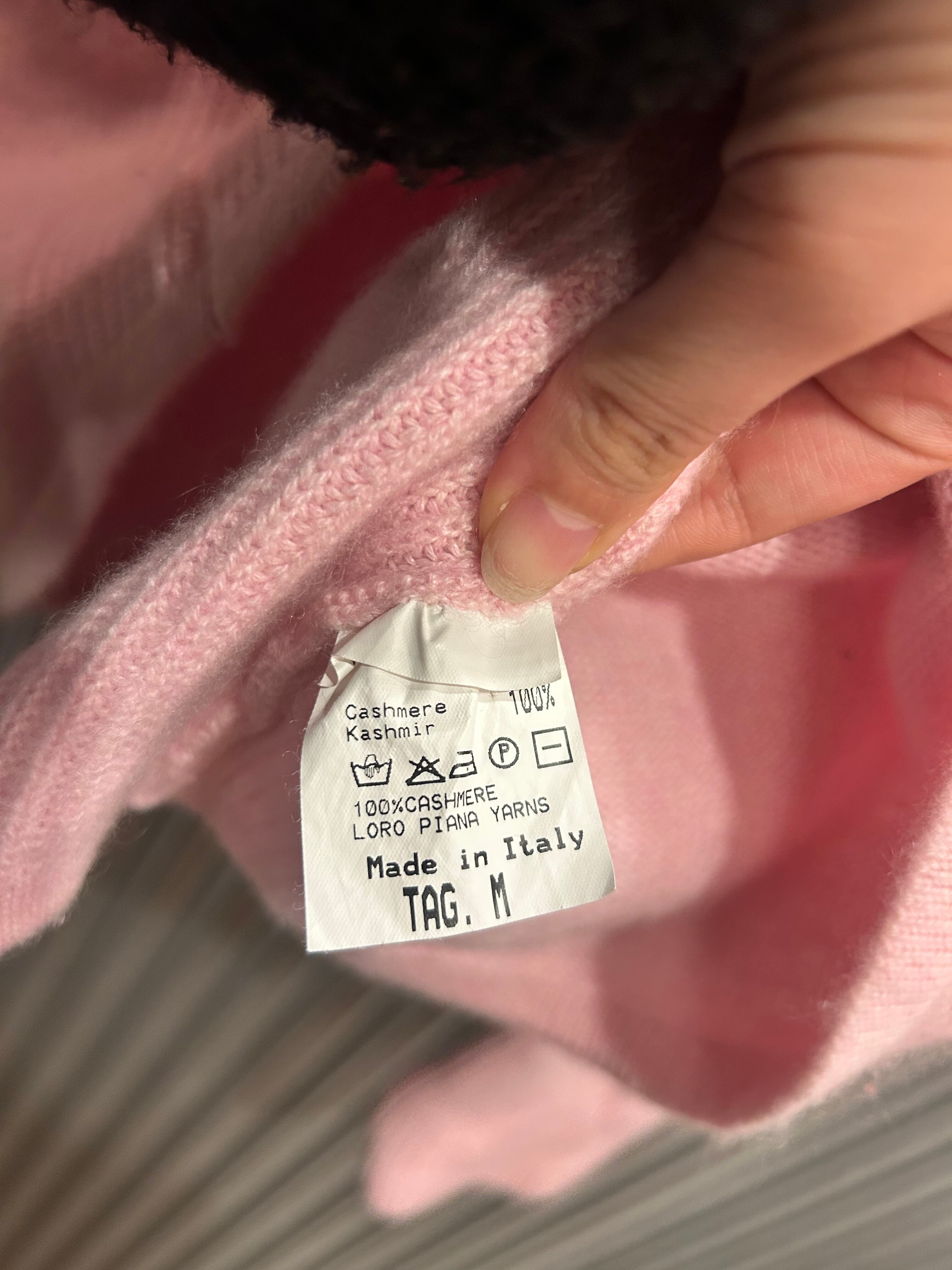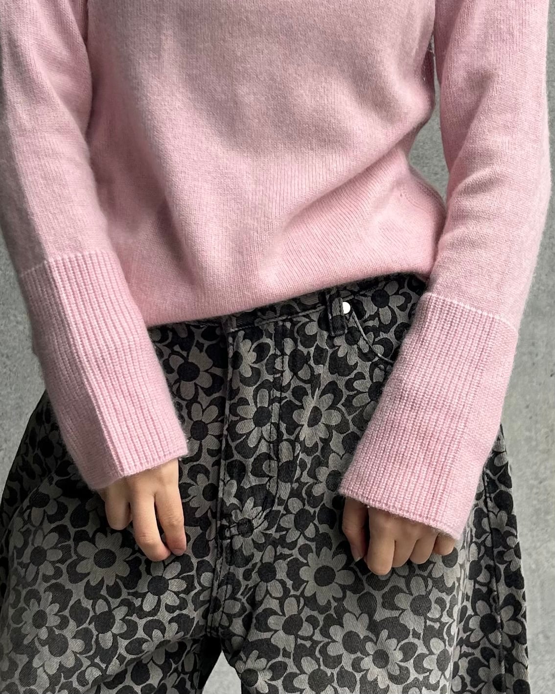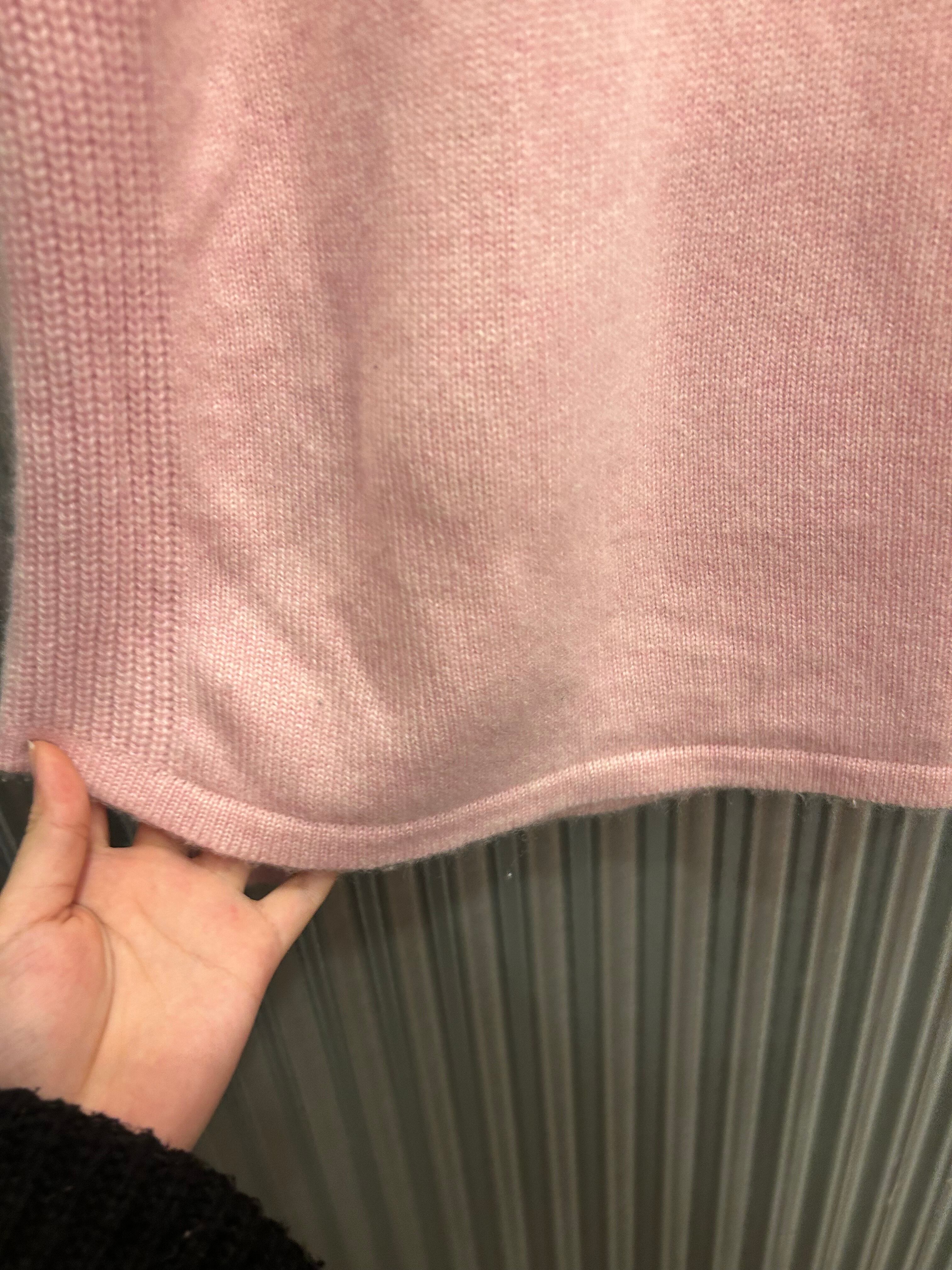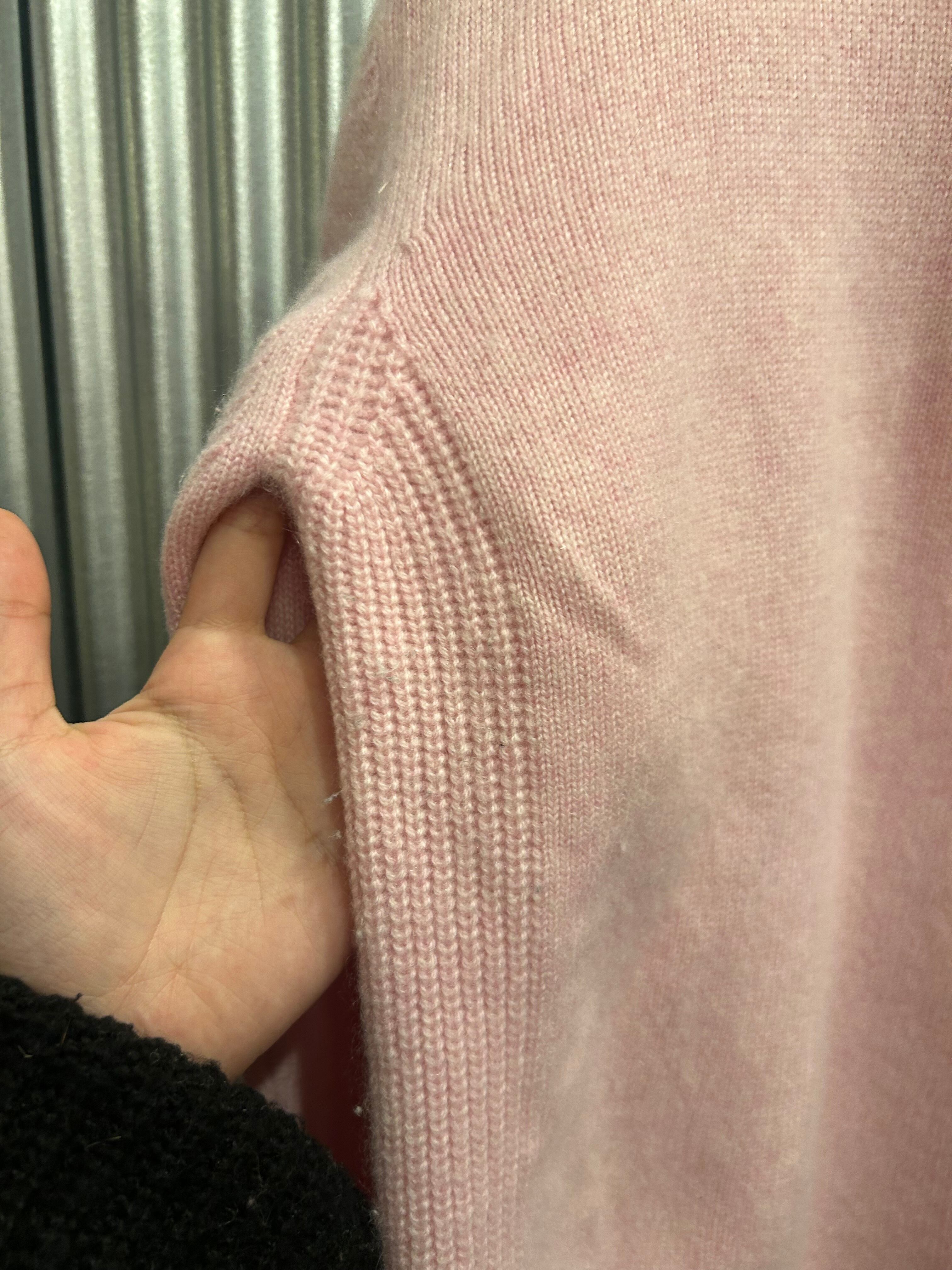 柔らかなピンクカラーが目を引く、ハーフジップデザインのリブニット。