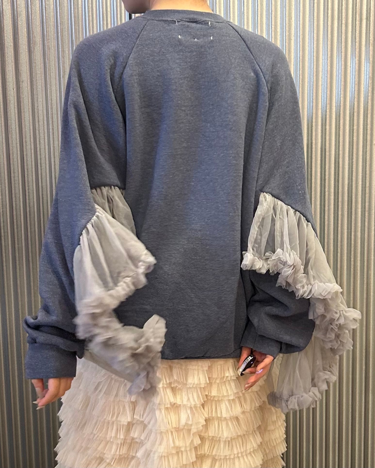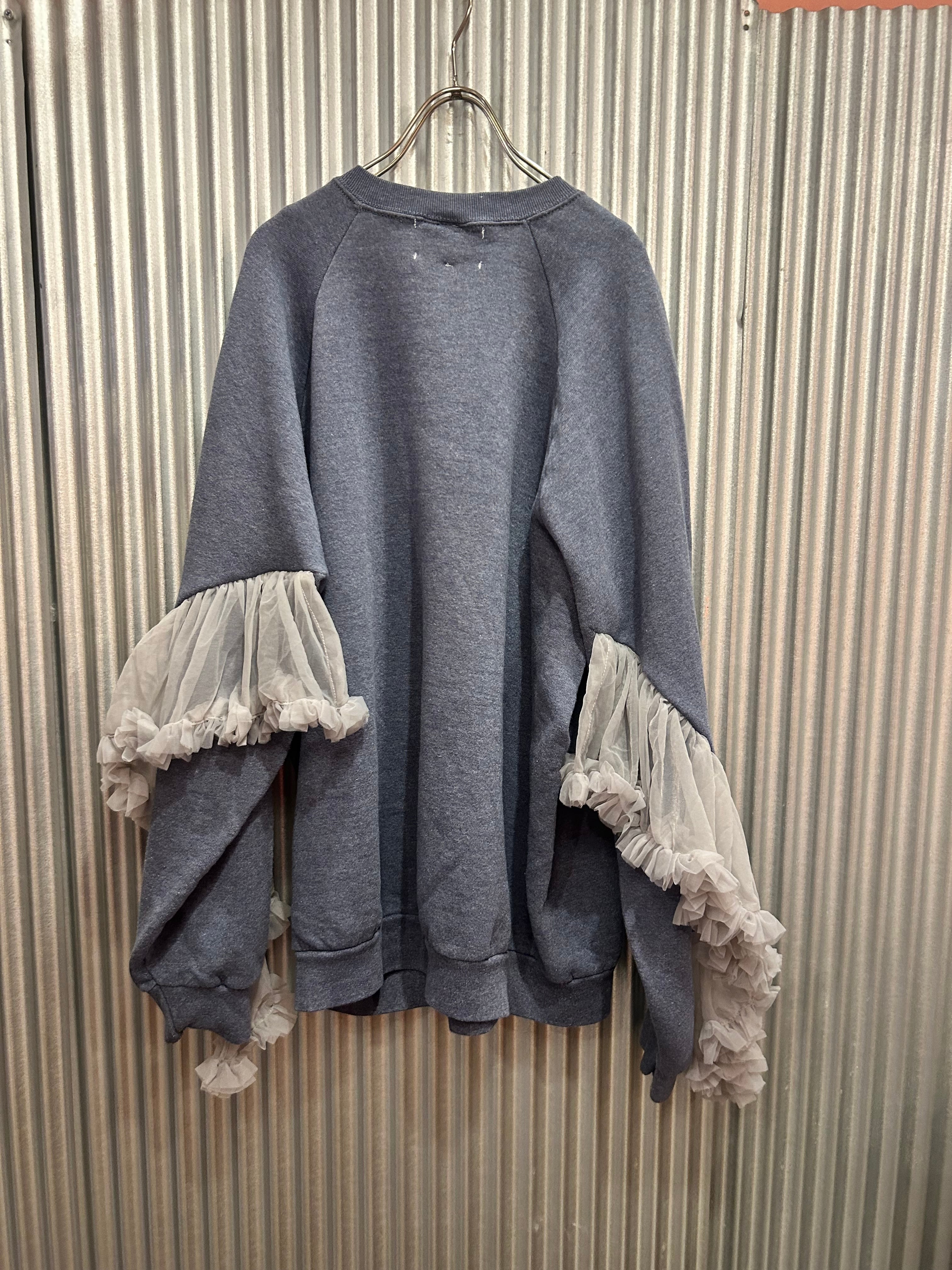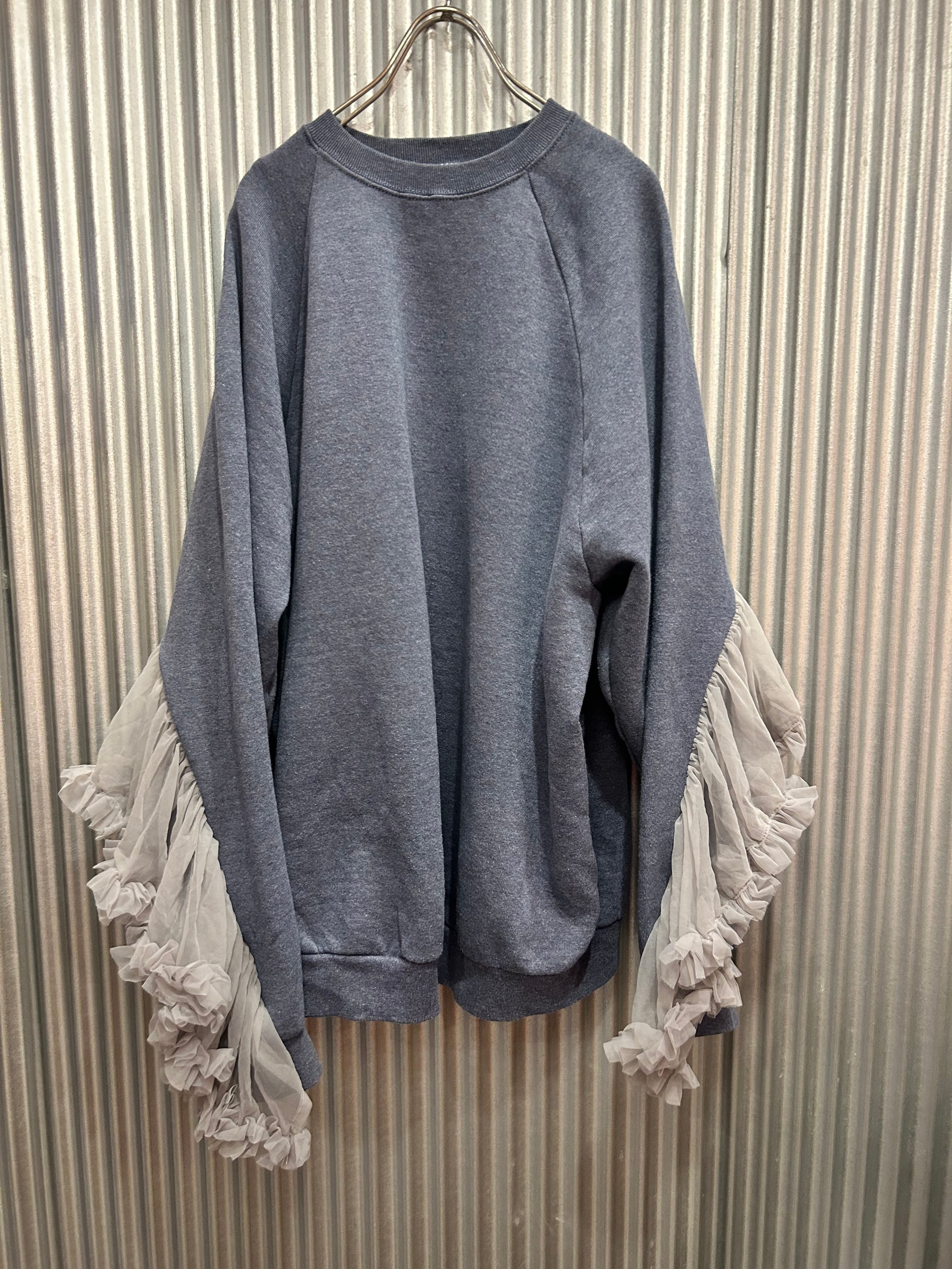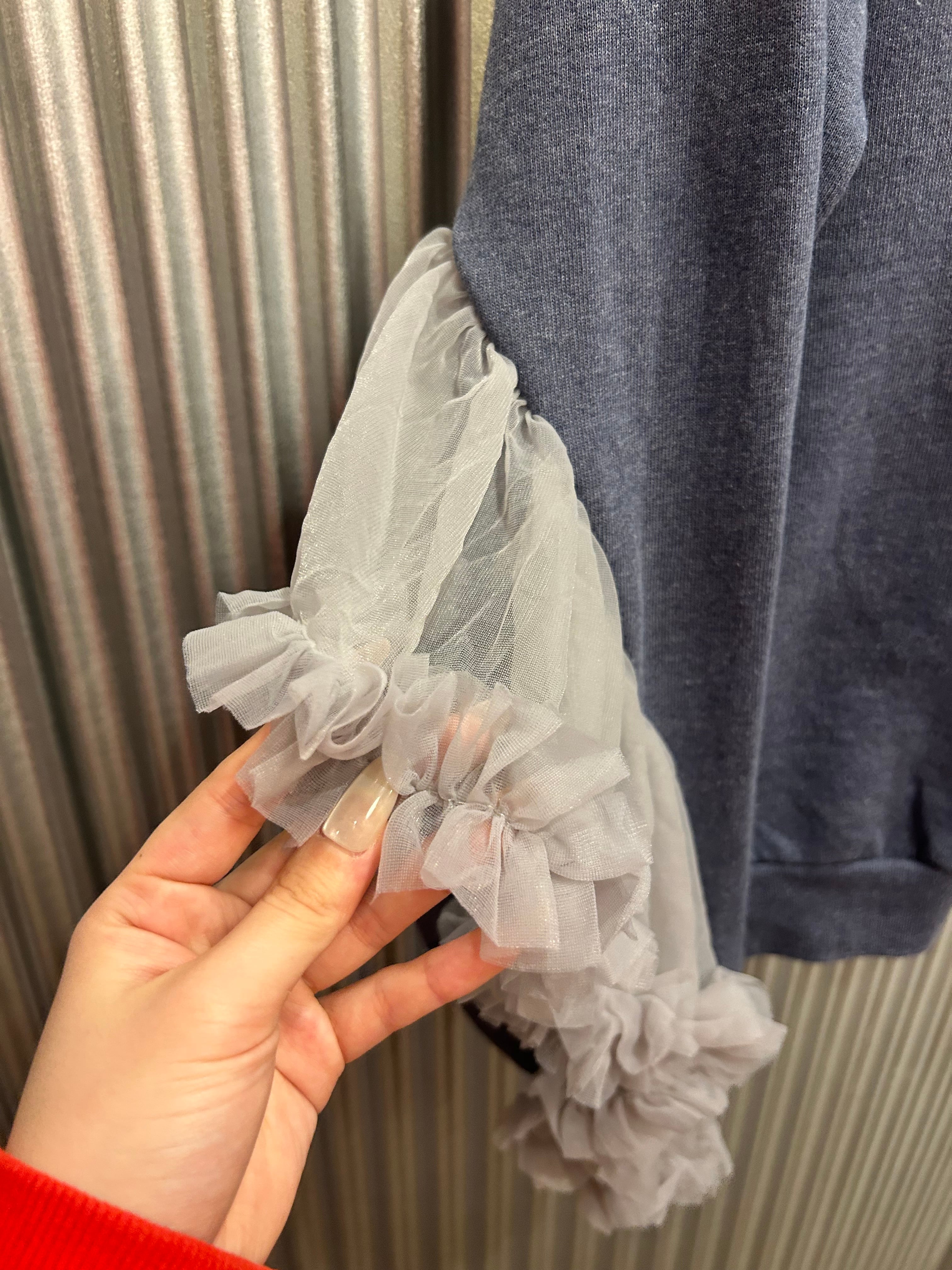 シンプルなスウェットに袖部分に大胆なチュールフリルつけたしたリメイクトップス。