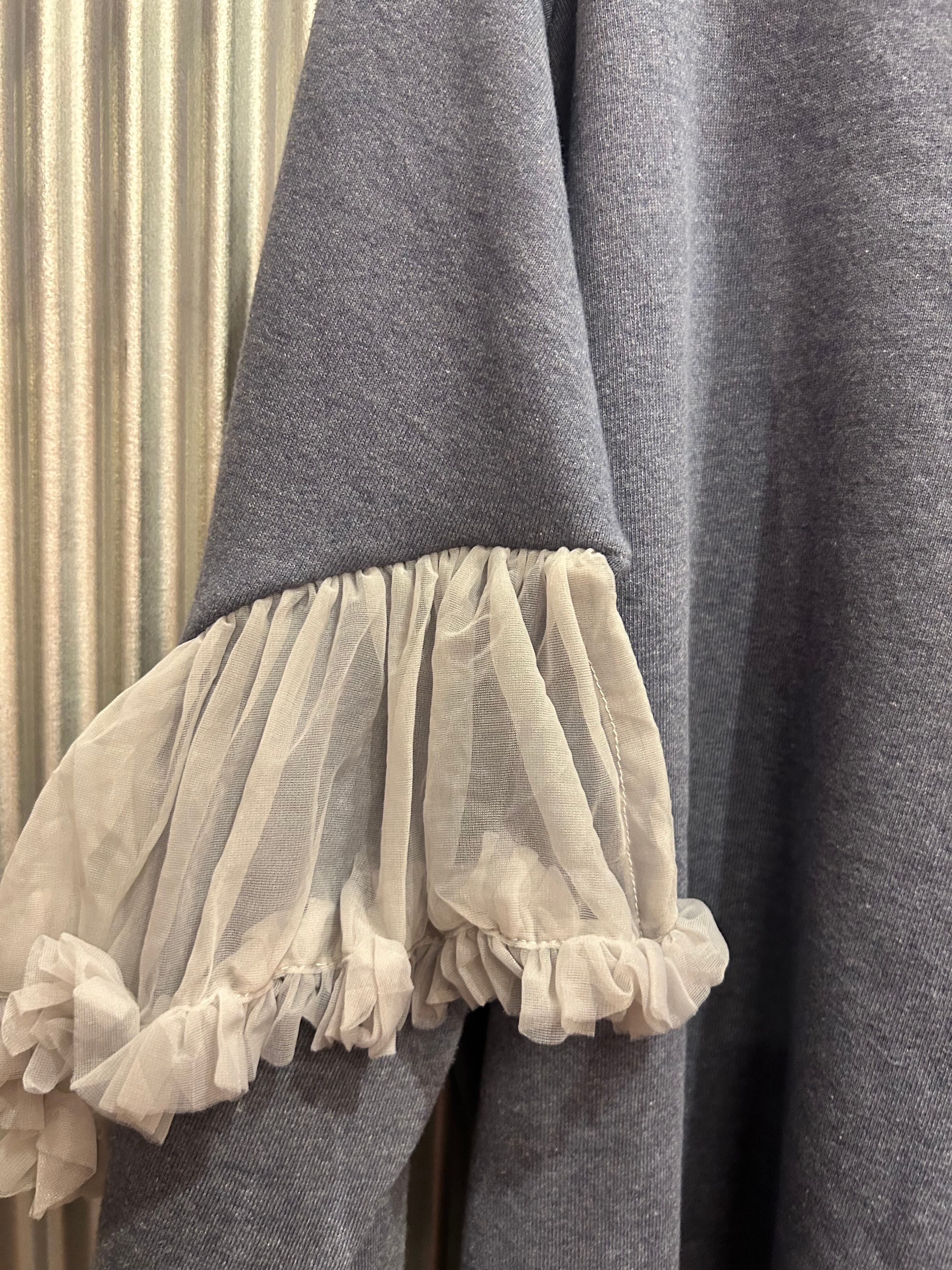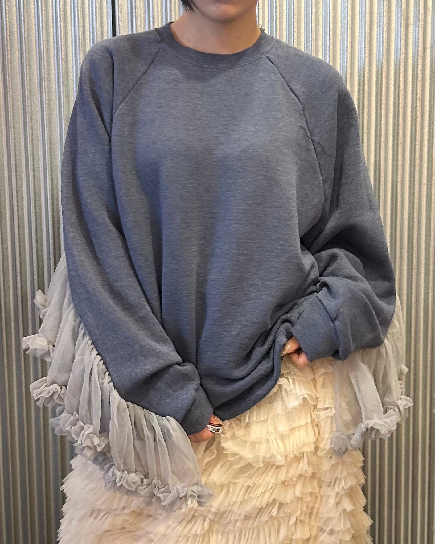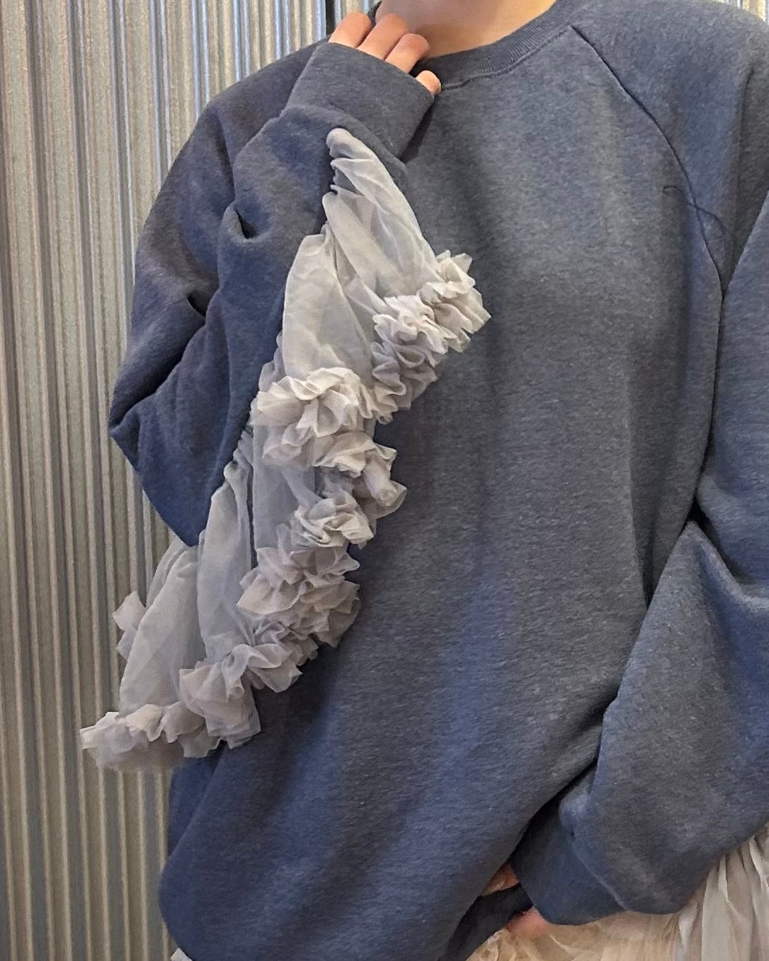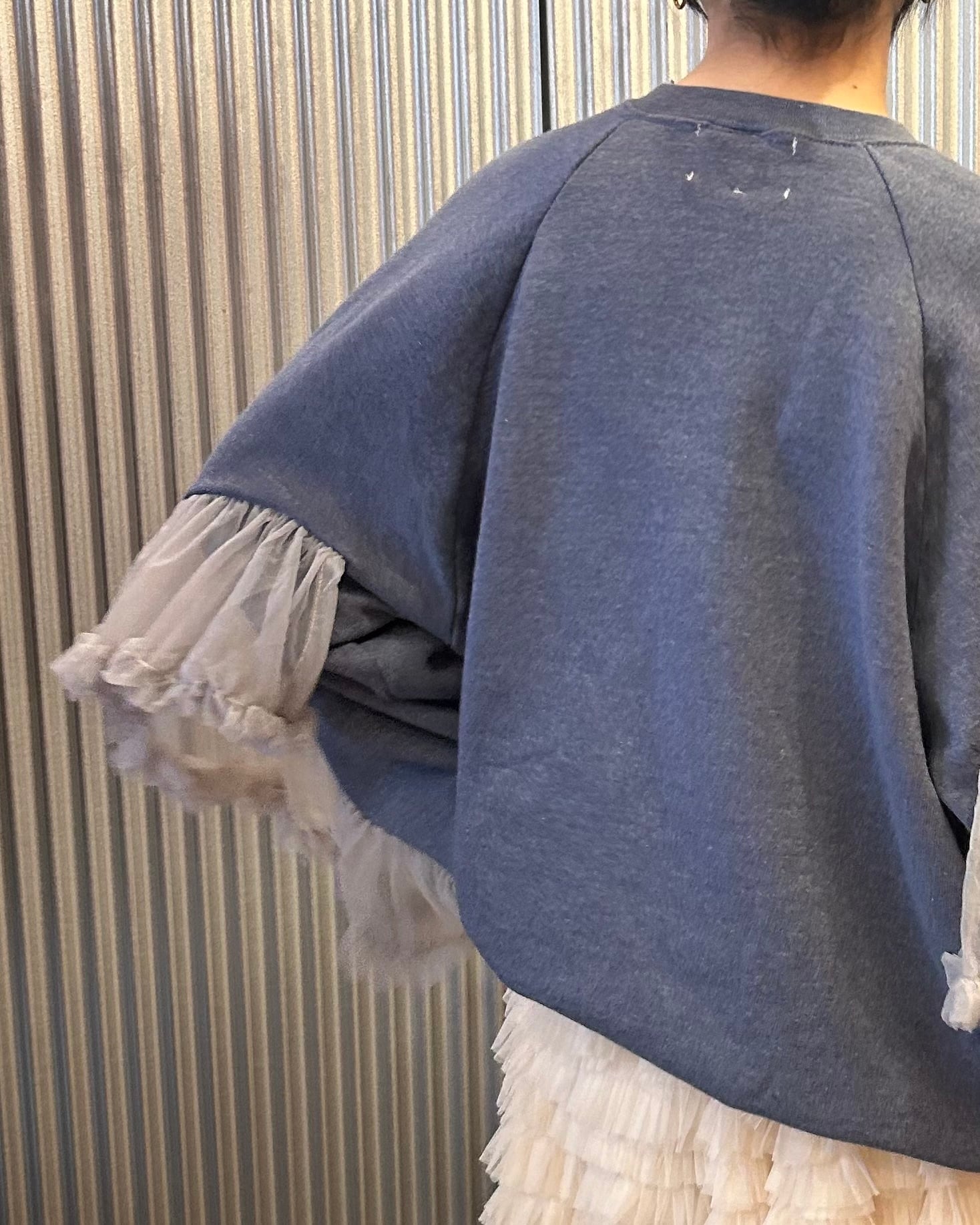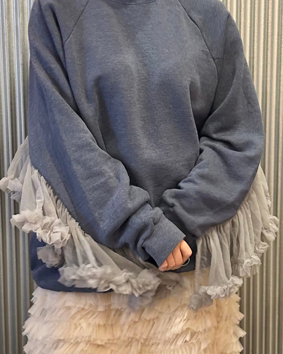 シンプルなスウェットに袖部分に大胆なチュールフリルつけたしたリメイクトップス。