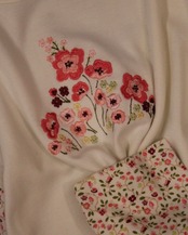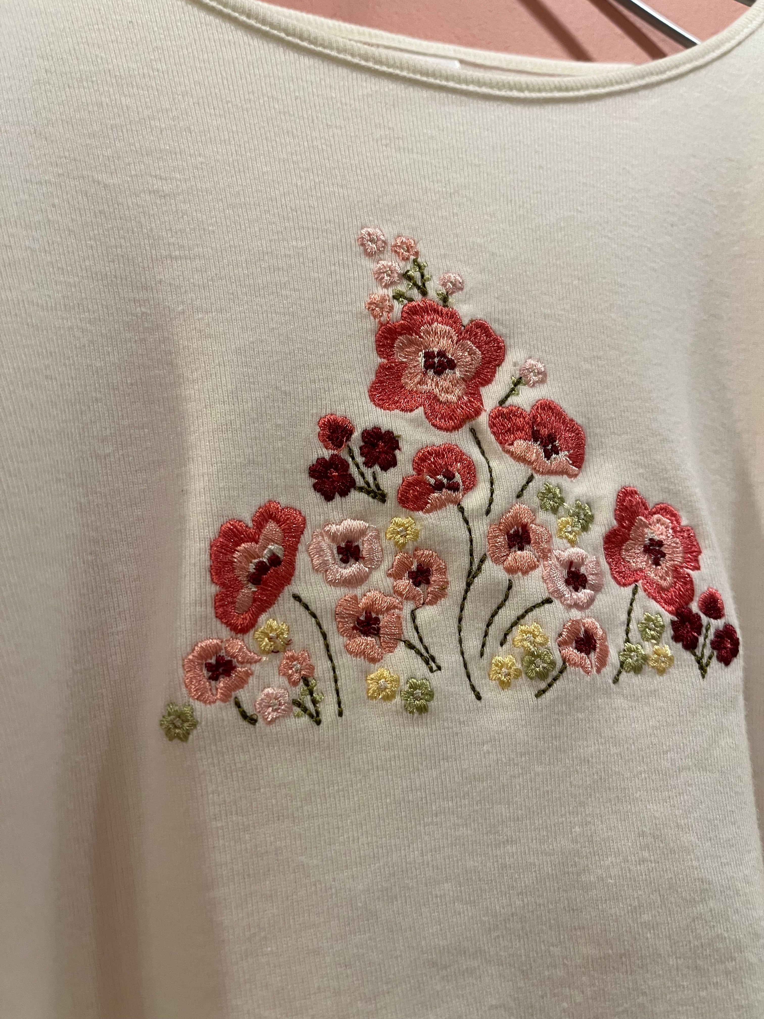 フロントのフラワー刺繍がアクセントになり、ナチュラルでフェミニンな雰囲気に仕上げています
