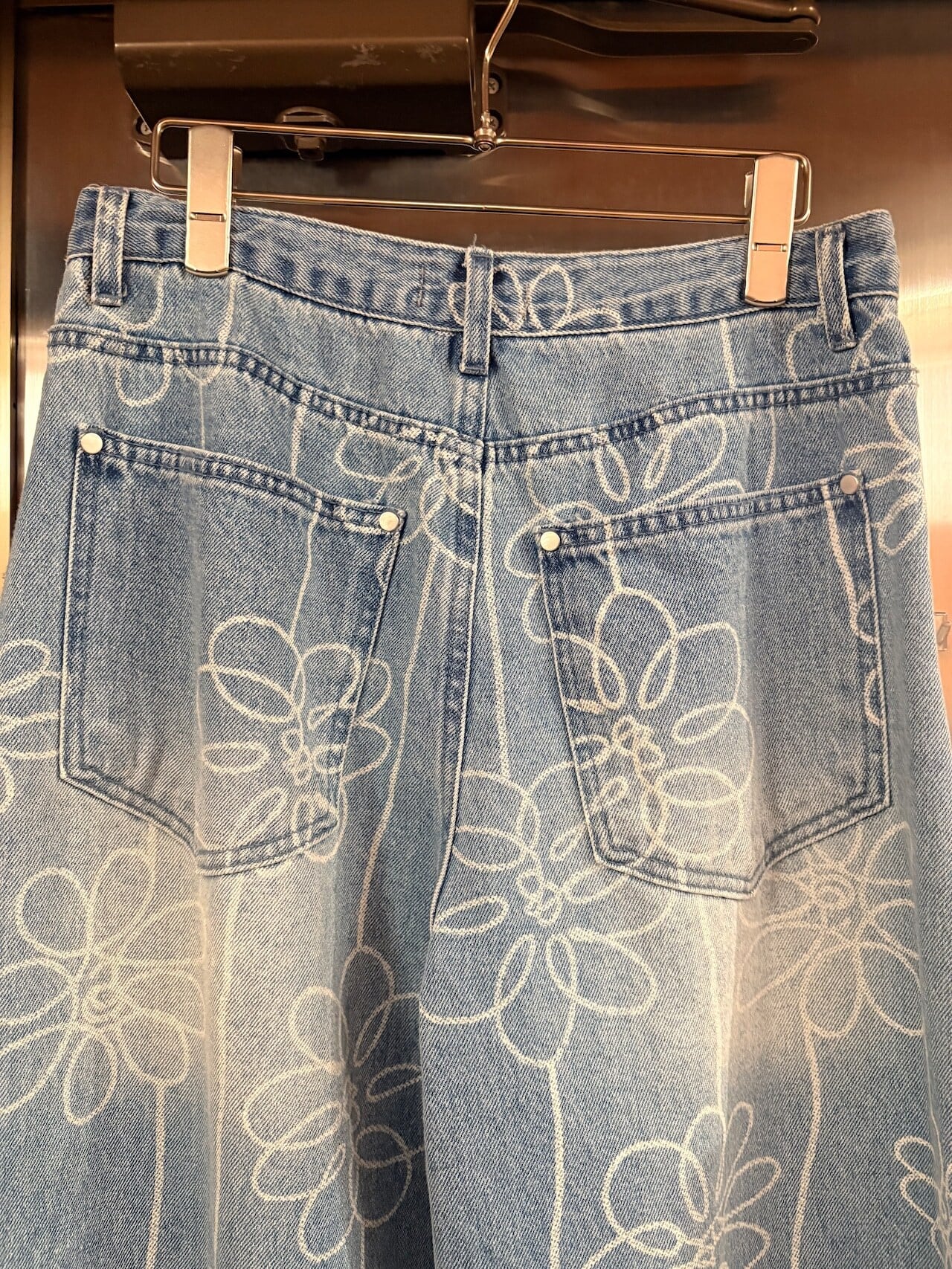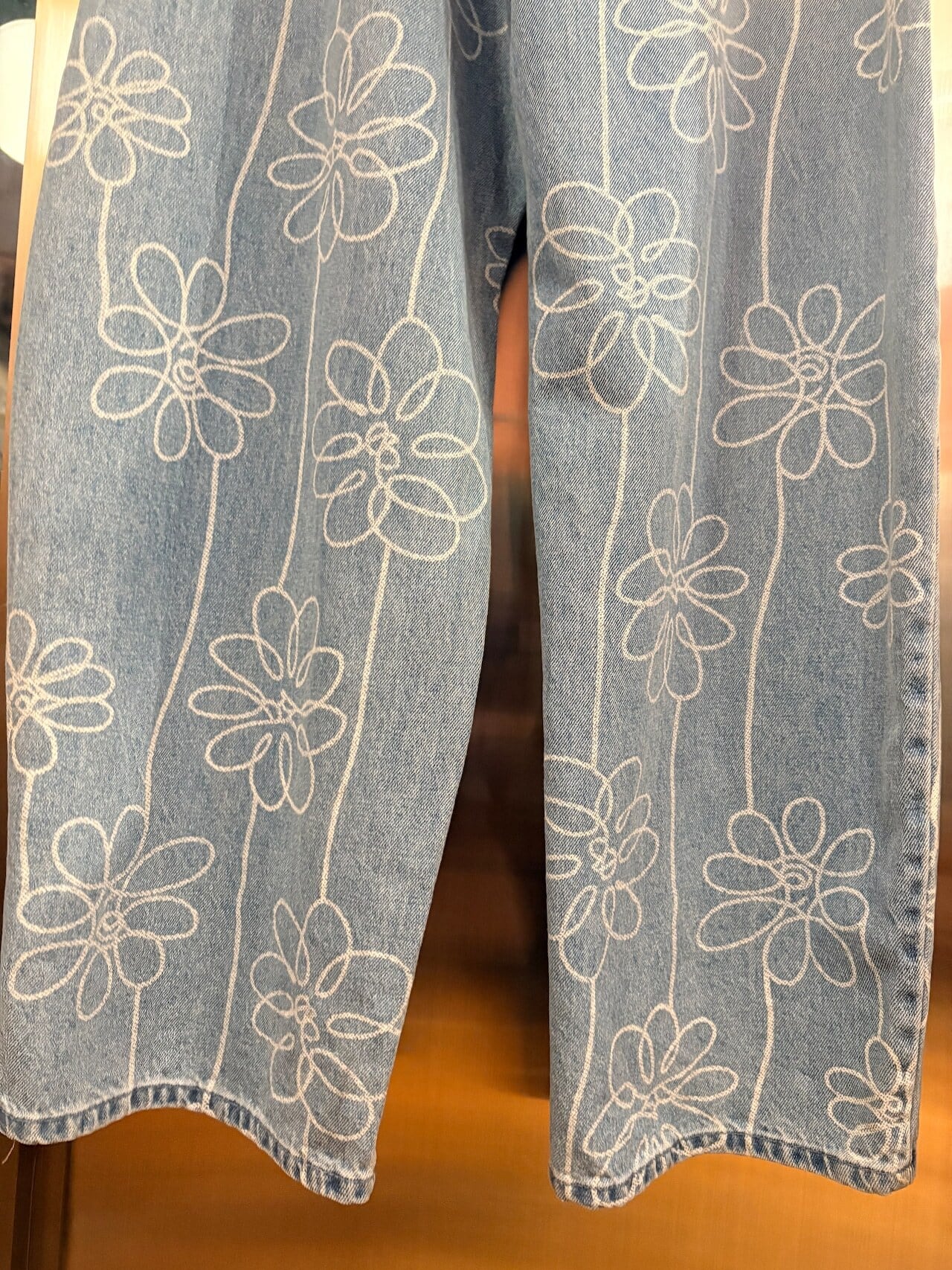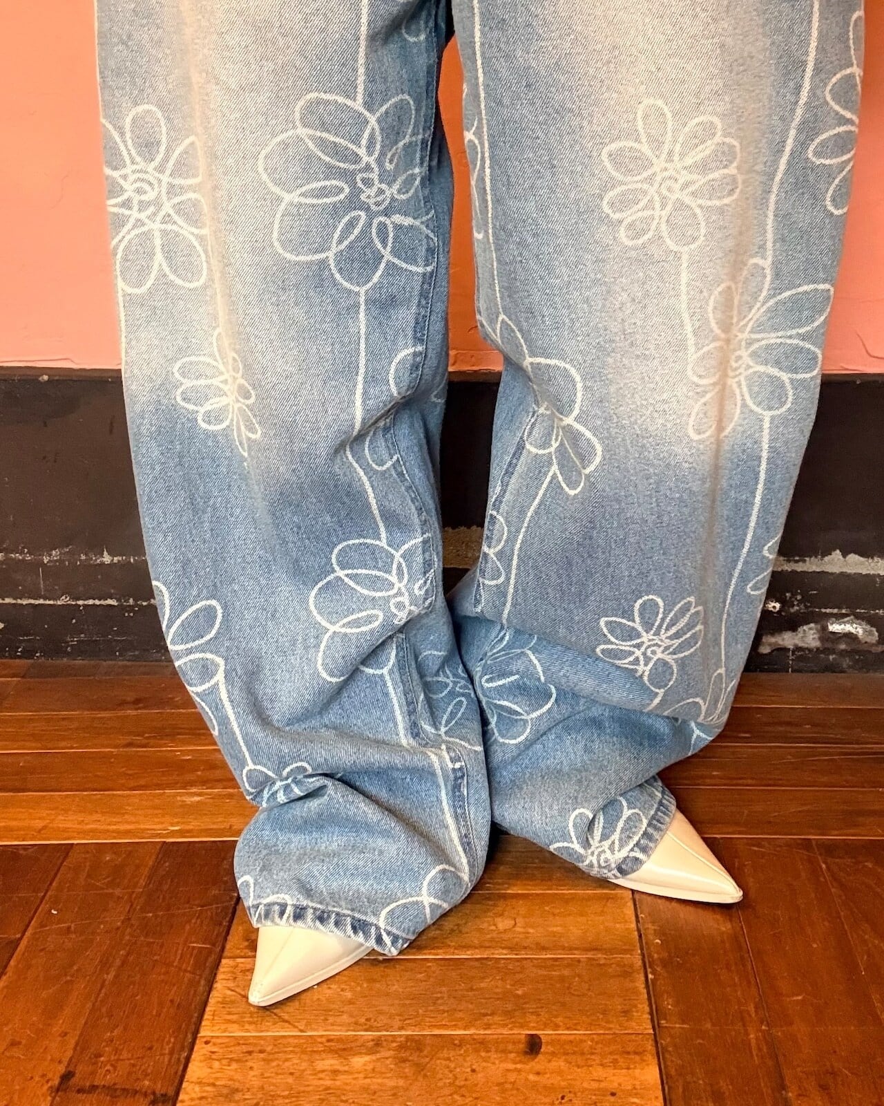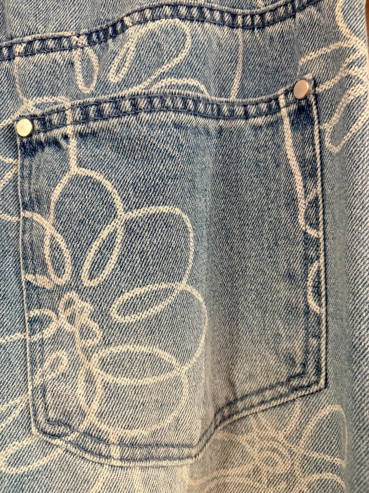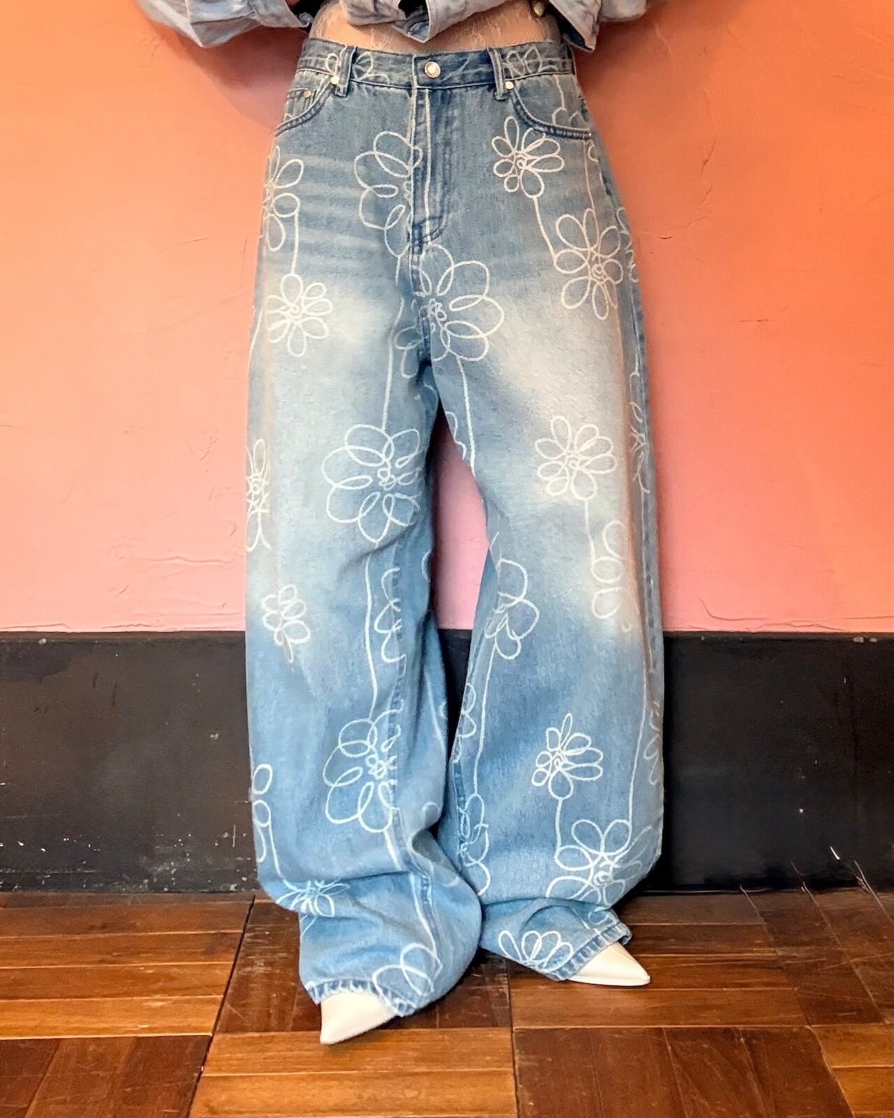 手書き風のお花モチーフデザインがかわいいデニムパンツ。カーブシルエットが美しく、オーバーなサイズ感なので、裾をためてヒールと合わせるのがおすすめです☺︎