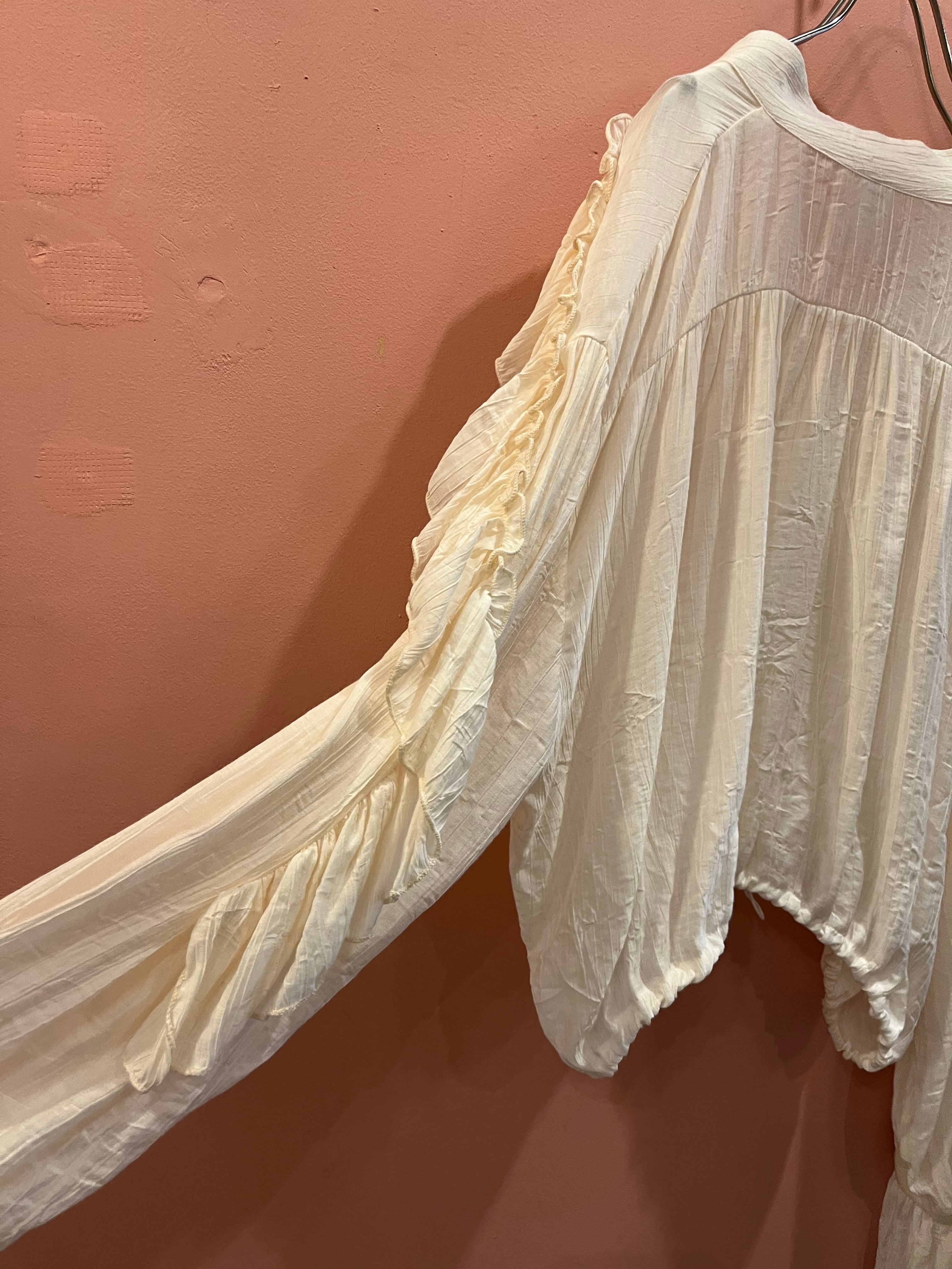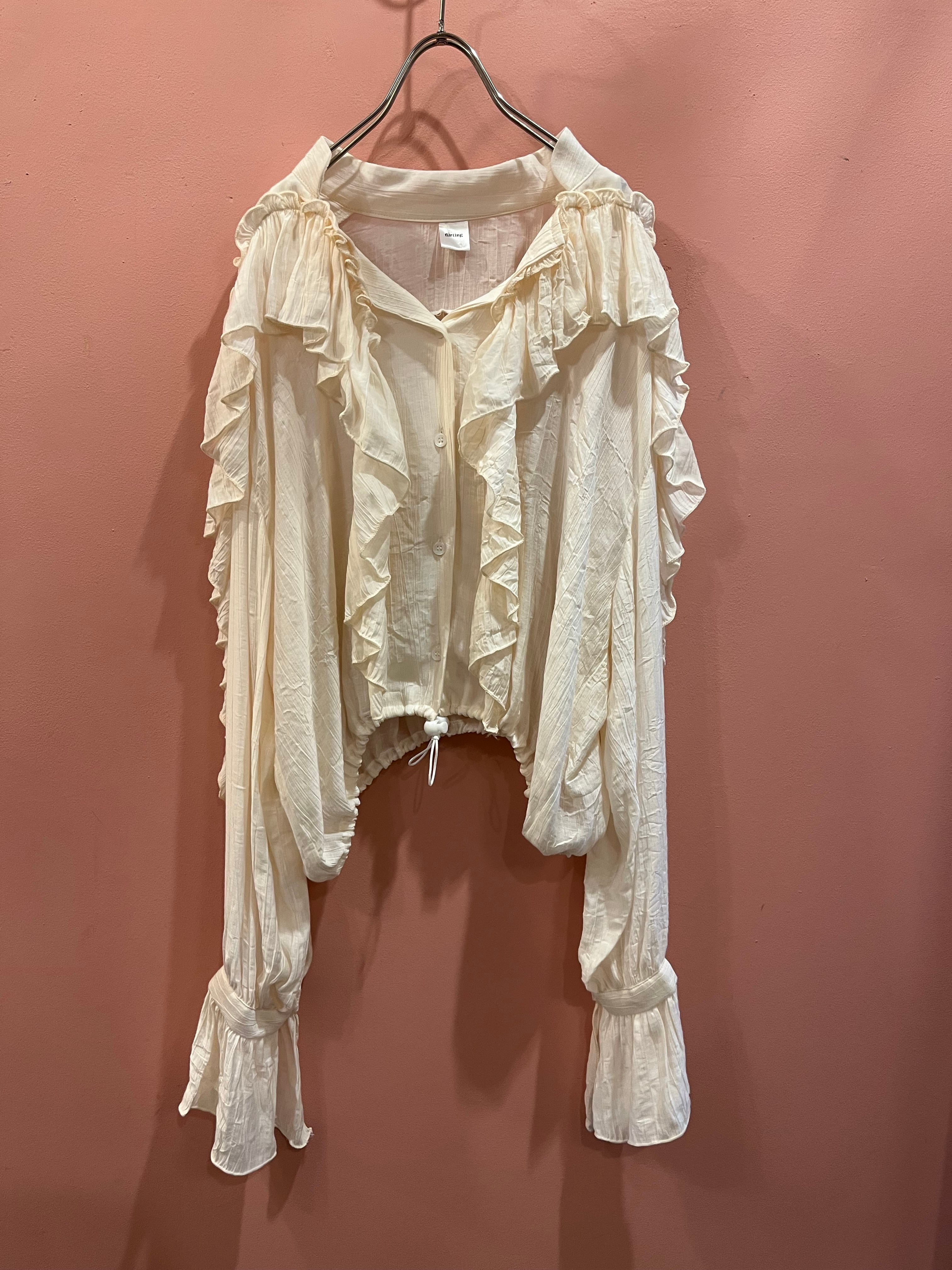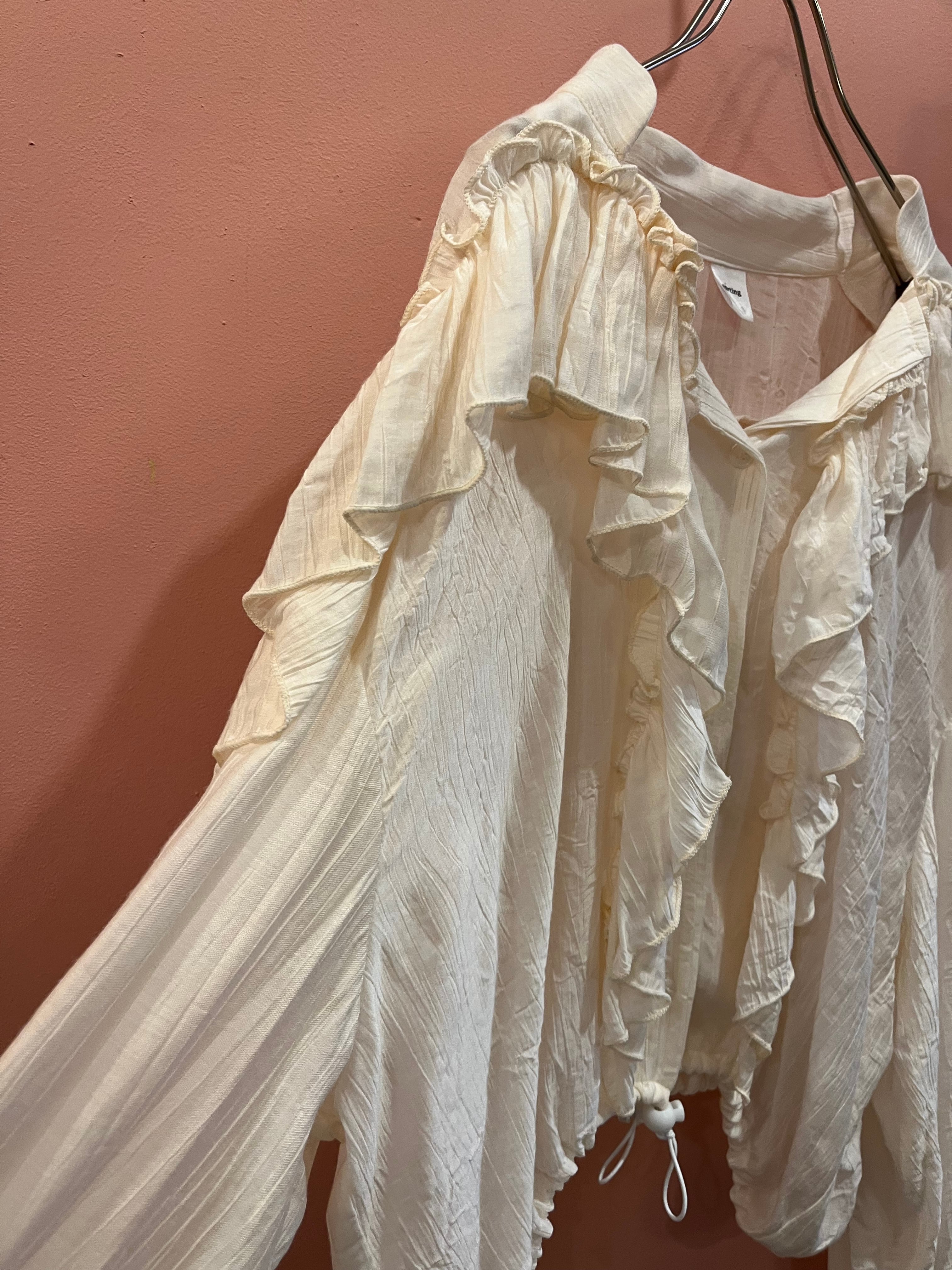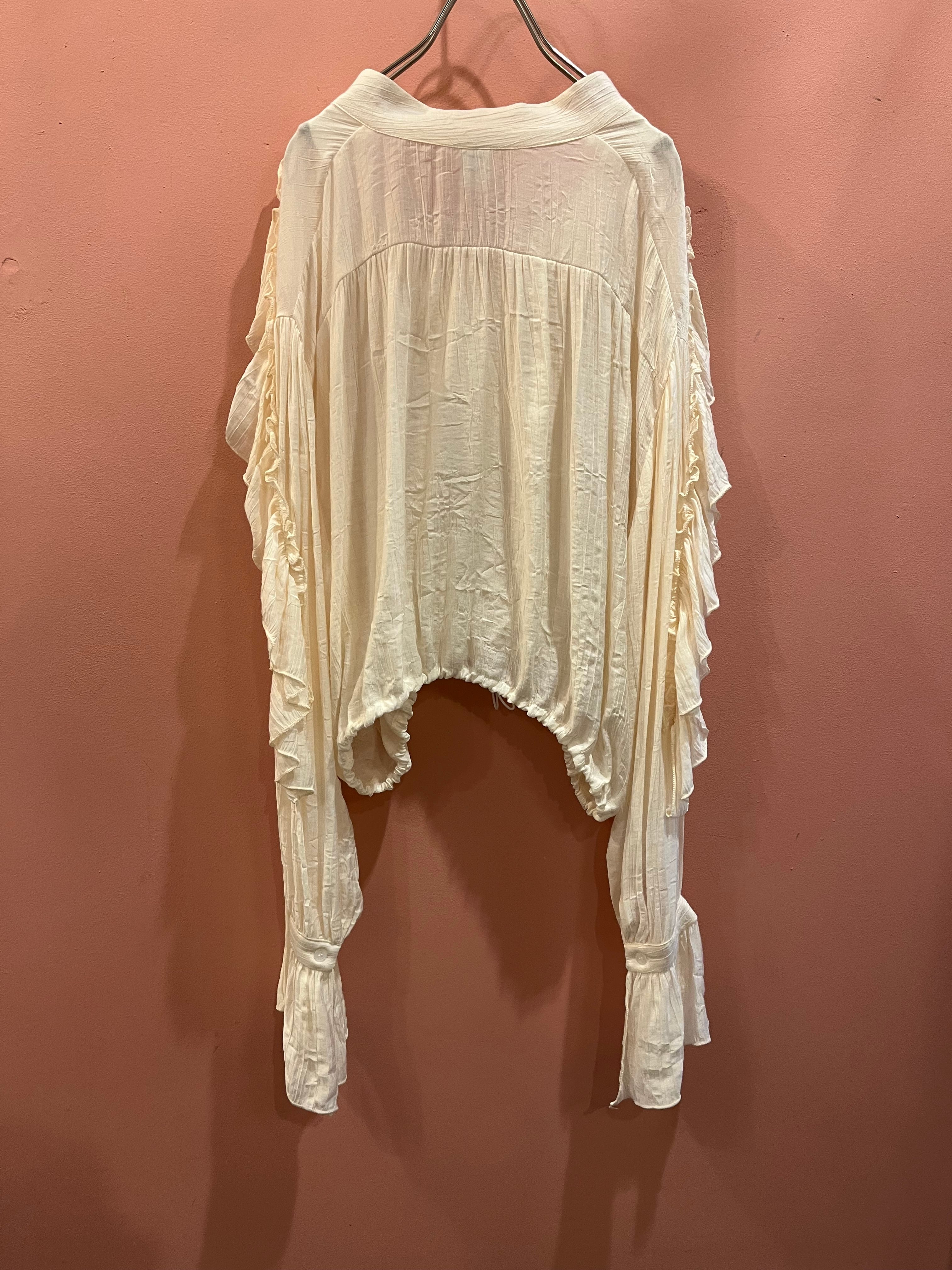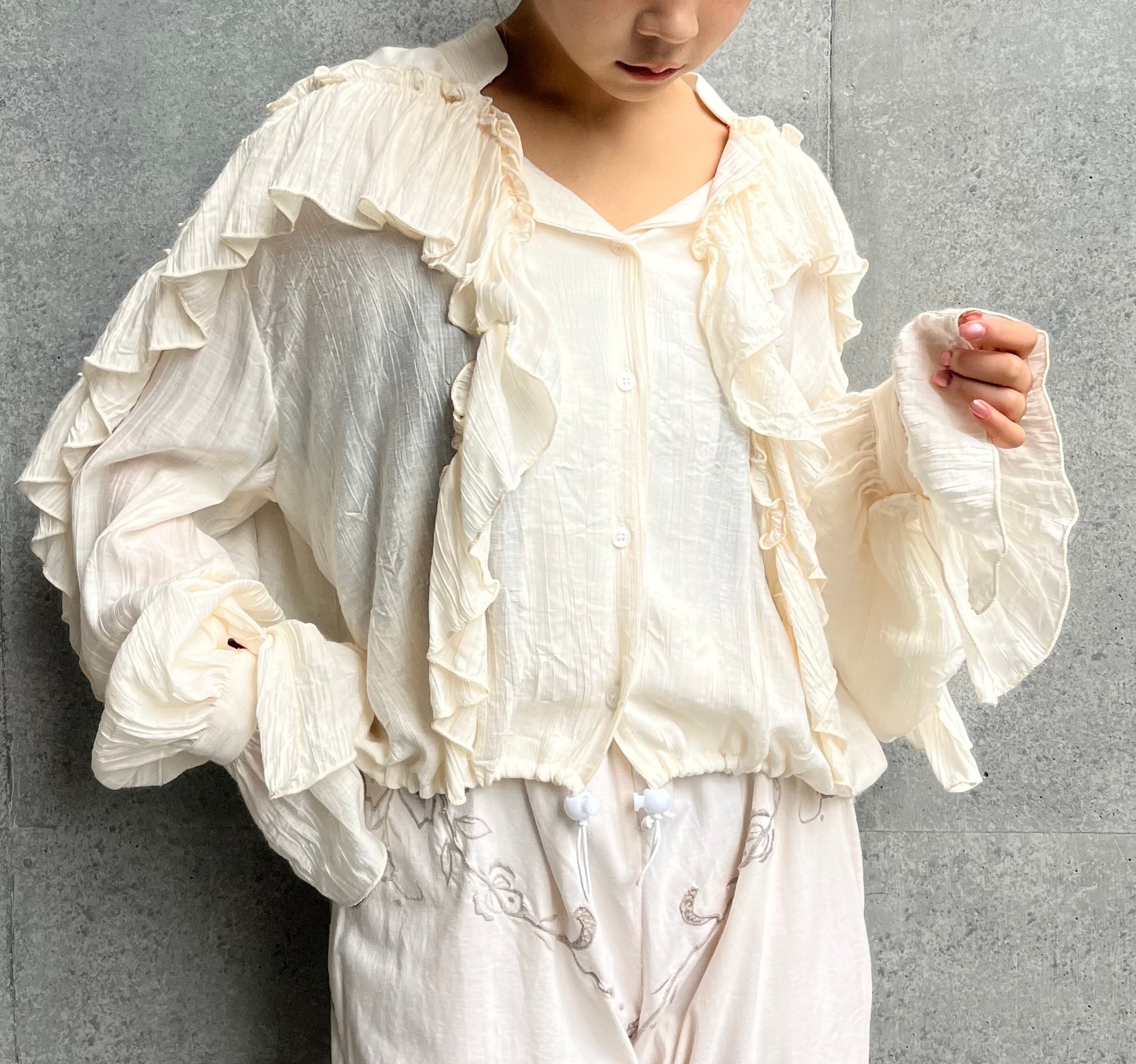 やわらかなアイボリーに、たっぷりのフリルが目を惹くデザインのブラウス