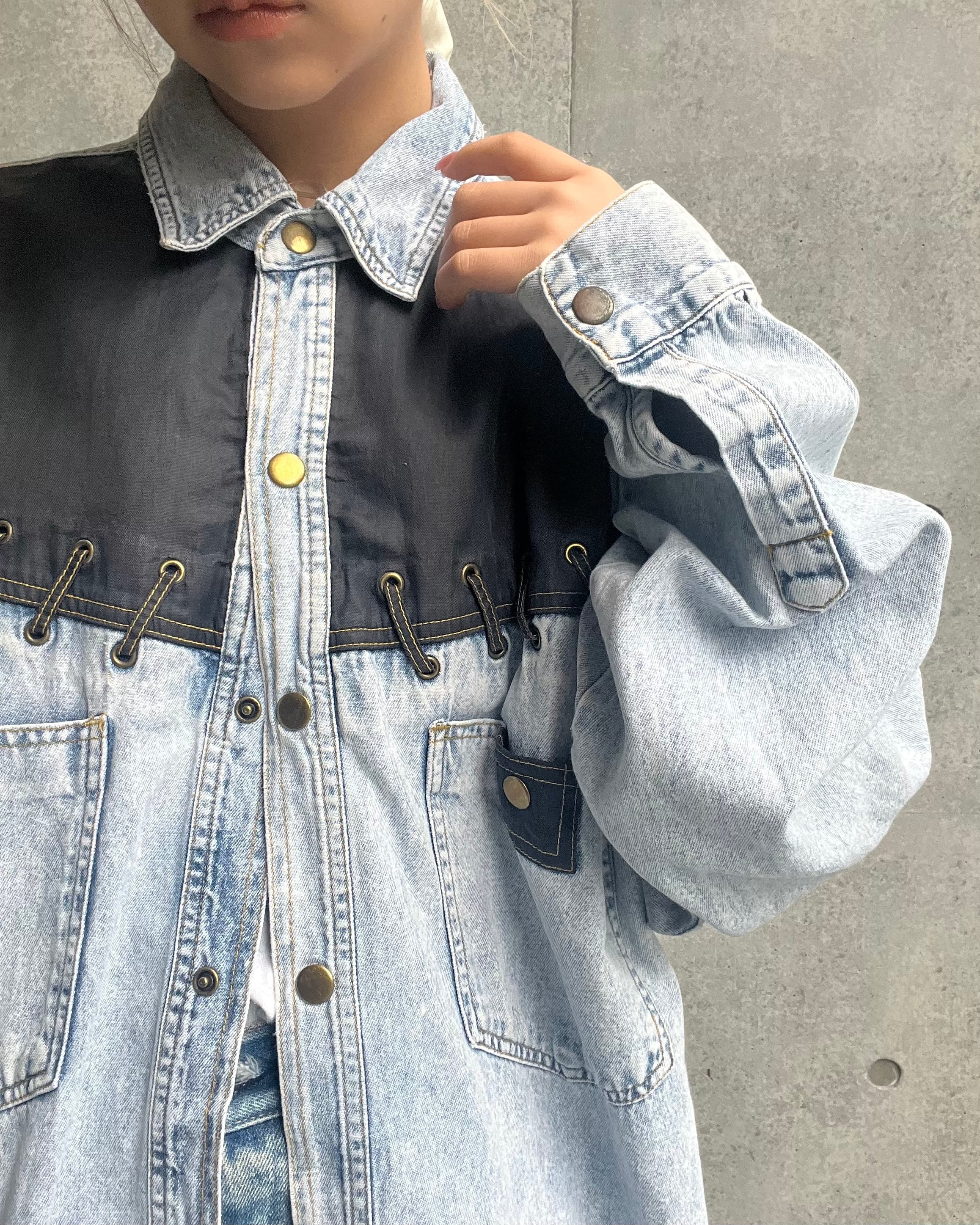 デニム×ブラックの切替デザインが目を惹くオーバーサイズシャツ