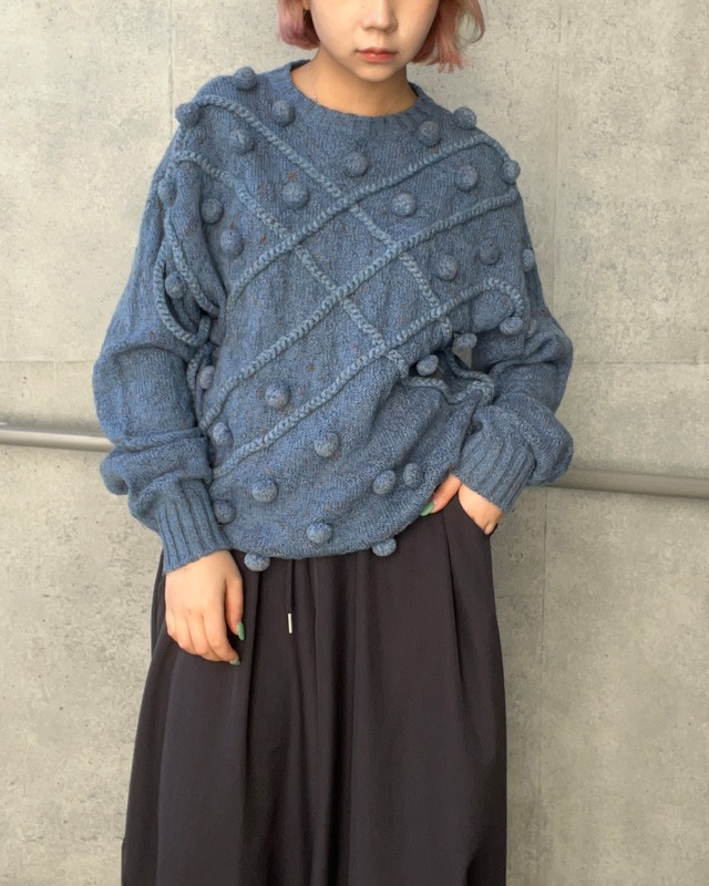 ポンポン付きのハンドメイドセーター 不規則に交差した立体的な糸は、ところどころ縫われていたり、縫われていなかったり、動きのあるものに仕上がっています 身幅が広く袖は太すぎないので、華奢見えするのも◎ ⚫︎サイズ (平置き cm) 着丈 約64 肩幅 約55 身幅(脇下から計測) 約56 袖丈(脇下から計測)約55 着用スタッフ身長154 ※極力正確に採寸しておりますが、商品によって多少の誤差が生じる場合がございます為ご了承下さいませ。 ⚫︎素材 表記なし ⚫︎コンディション 目立つもの以外の記載はしておりませんので、 古着の特質上、使用感に関してはご理解下さいませ。少しでも不安がありましたら、お気軽にお問い合わせ下さいませ。 【商品のキャンセルについて】 商品発送後のキャンセルは承っておりません。 ならびに、似合わない想像と違うなどの個人的な理由での返品交換はお受けできません。 予めご了承くださいませ。 ※店頭販売と並行しておりますので、決済後でもsoldの場合がございます。お客様には大変ご迷惑をかけいたしますが予めご了承下さいませ。